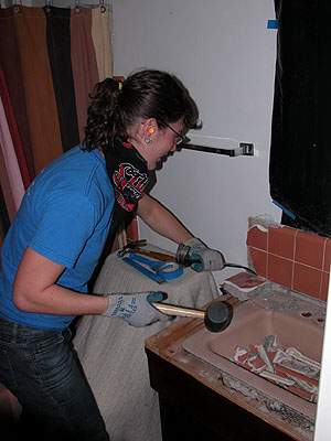 Erica demonstrating the nearly 2 inch thick concrete we are busting out.