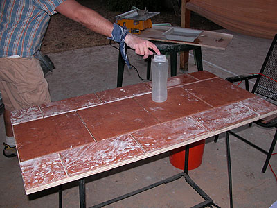 A table + Tile = good practice for the sinks top. These tile have been cut on the tile saw in background and are laid out for reference. A simple pattern.